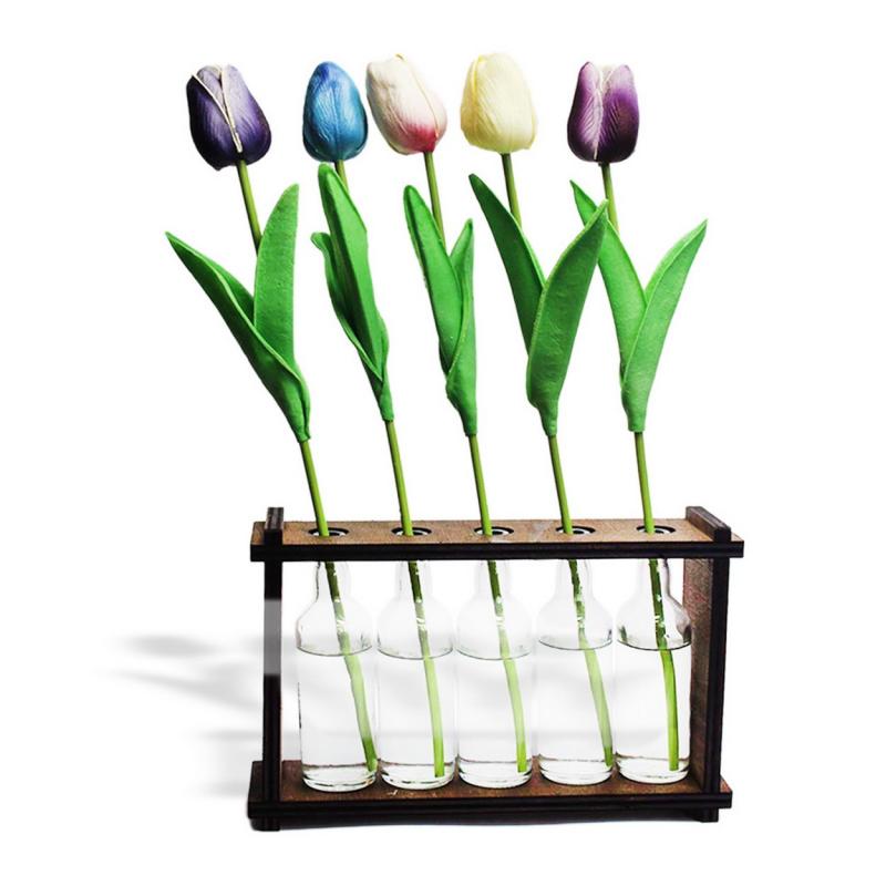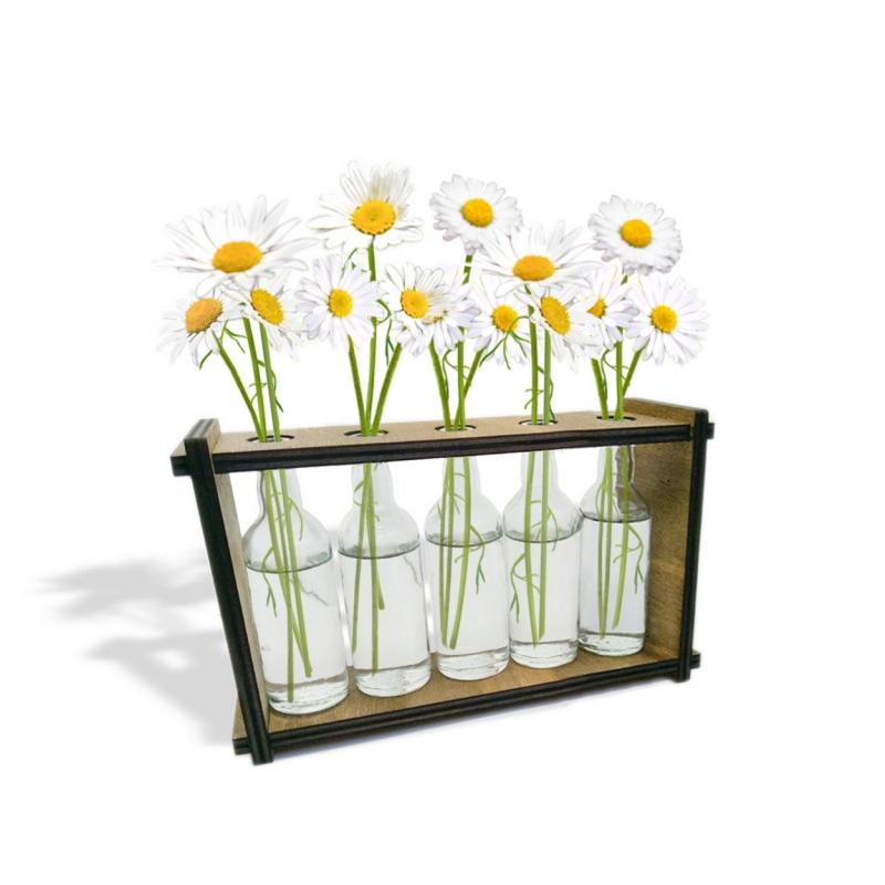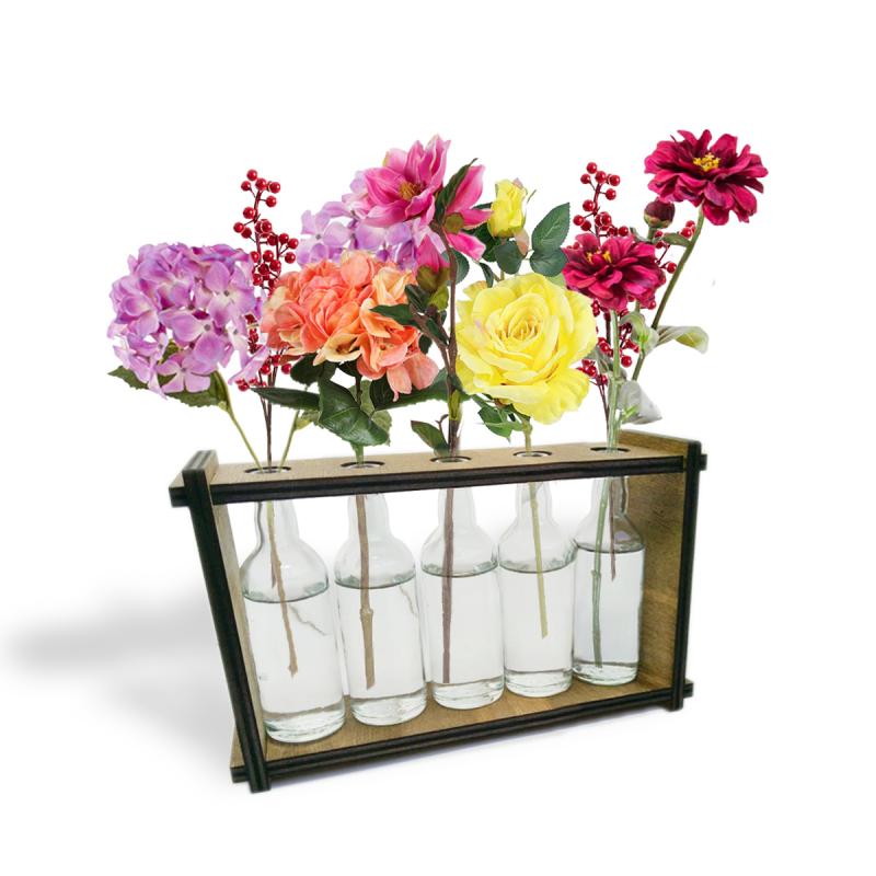5'li Ahşap Standlı Cam Şişe Saksı Seti, Çiçekler Ürüne Dahil Değildir.