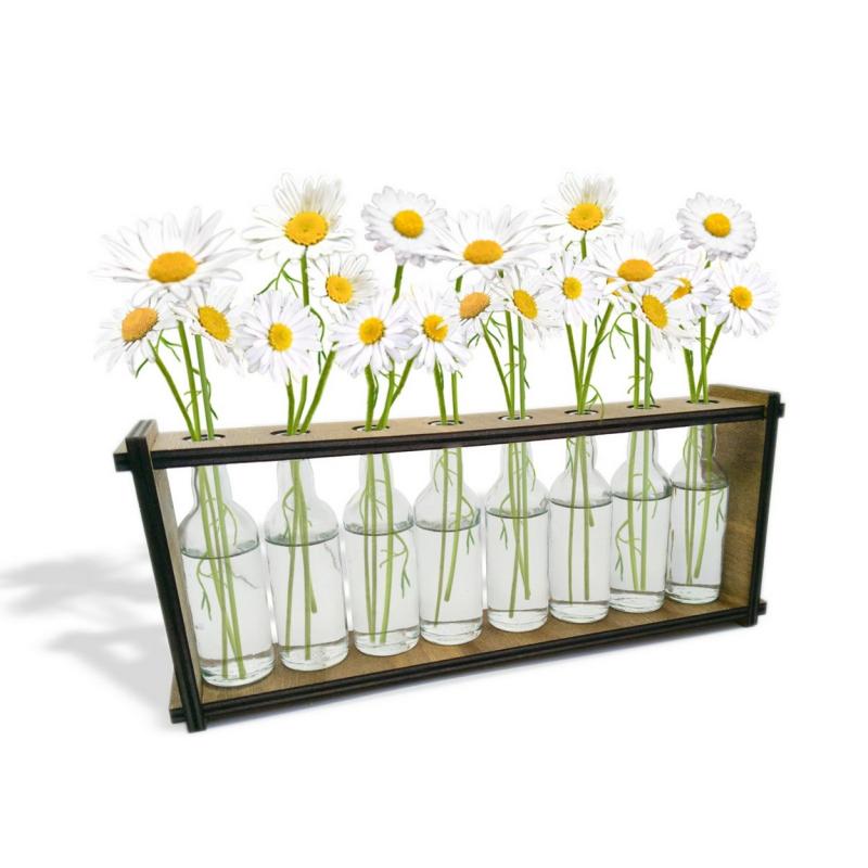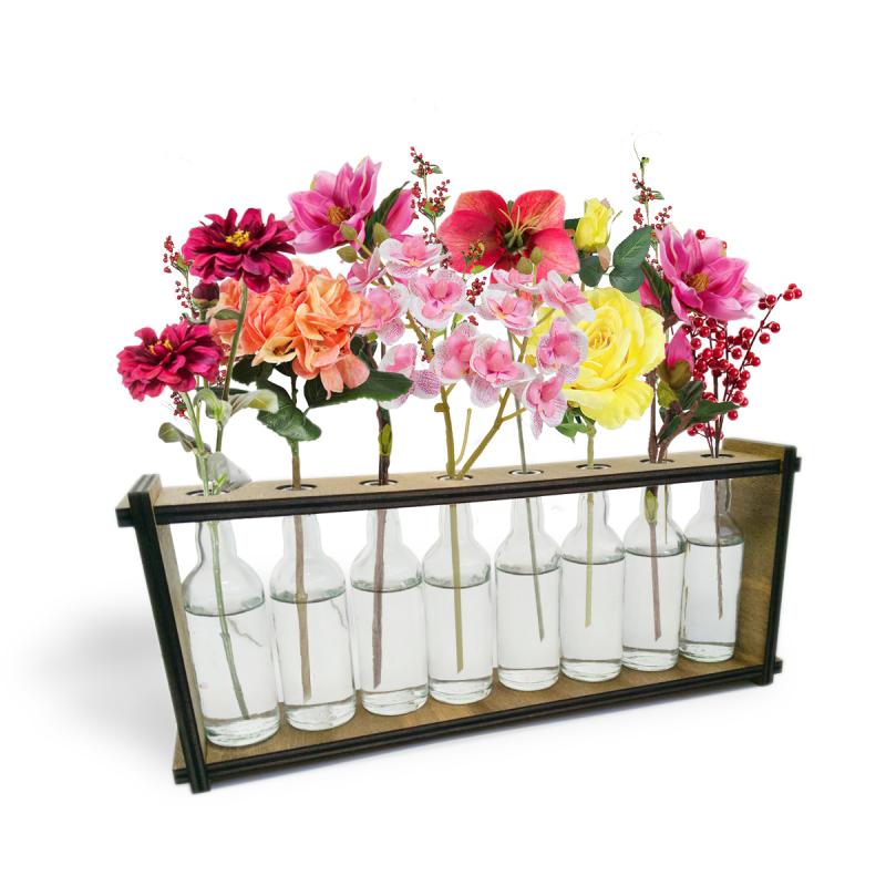 8'li Ahşap Standlı Cam Şişe Saksı Seti, Çiçekler Ürüne Dahil Değildir.