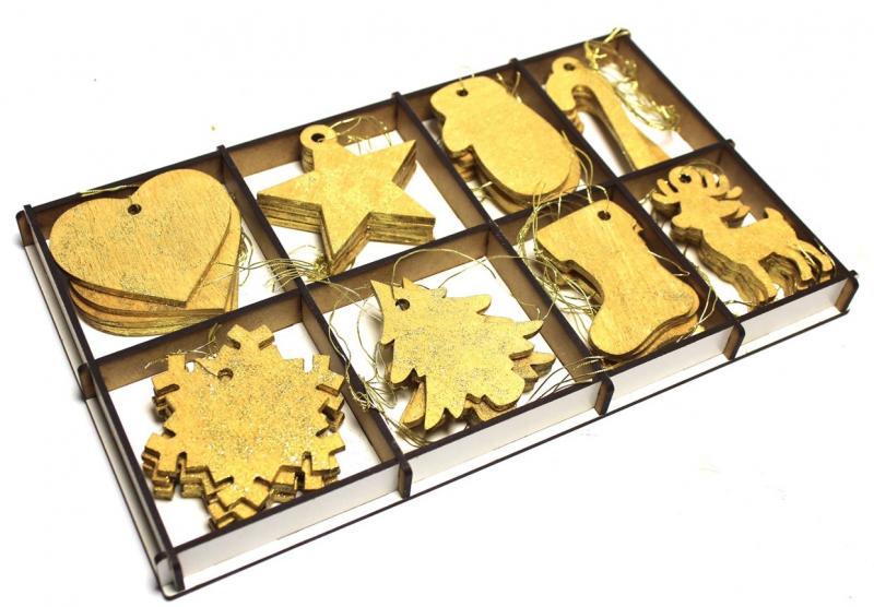 Altın Rengi Yılbaşı Ağacı Süsü 8 Model Ahşap Kutuda, 32 AdetHK0360-200