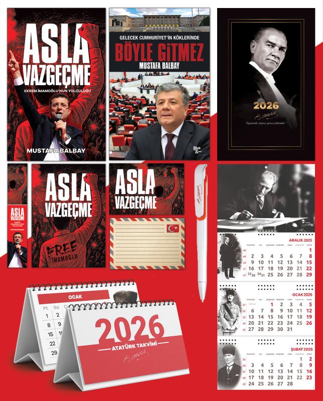 - ASLA VAZGEÇME - MUSTAFA BALBAY "Ekrem İmamoğlu, İstanbul Büyükşehir Belediye Başkanlığı'nı 2019 ve 2024'te üç kez kazandı. Her seferinde, “Daha fazlasını yapabilirim” mesajını verdi. 2023'te Cumhuriyet Halk Partisi'nde değişimin önünü açan kişi olarak, “Türkiye'yi de değiştireceğiz” diye haykırdı. Sırada cumhurbaşkanlığı vardı. Bu hedefe yürürken 23 Mart 2025'te tutuklandı. İmamoğlu önüne her engel konduğunda şöyle haykırdı: “Asla vazgeçmeyeceğim!” Bu söz aynı zamanda tüm Türkiye'ye idi. Tutuklanmasına giden yolla, cumhurbaşkanı adaylığına giden yol Silivri'de kesişti. Esareti göze alarak, cesareti örgütledi. Türkiye ayağa kalktı. CHP Genel Başkanı Özgür Özel, dipten gelen dalgayı uzun soluklu, iktidar hedefli bir yürüyüşe çevirdi. Mustafa Balbay, beş yıl hapis yattığı Silivri Cezaevi'nde İmamoğlu'yla üç kez görüştü. Mücadelesini kendi ağzından dinledi, yazdı. Bu kitapta, gerilimli, sürprizlerle dolu, macera romanlarını aratmayan olaylarla karşılaşacaksınız… Bu kitapta, pes etmeyi hafızasından silmiş, kararlı bir insanı daha yakından tanıyacaksınız… Bu kitapta, Silivri duvarlarına bakınca ufku gören bir liderin uzun yolculuğuna eşlik edeceksiniz…" BÖYLE GİTMEZ - MUSTAFA BALBAY Mustafa Balbay gündemi yakalayan yeni bir kitapla okurun karşısında. 16 Nisan referandumu öncesinde “İnsanı ve Devleti Yaşatmak İçin Hayır” kitabını yazan Balbay, Adalet yürüyüşünü “Vicdanın Ayak Sesleri Yürüyüş” adıyla eserleştirdi. Balbay bu kez parlementer sisteme son verecek, tüm yetkileri bir kişiye teslim edecek rejim değişikliği girişimine karşı şöyle diyor: Gelecek Cumhuriyet'in Köklerinde Böyle Gitmez. Balbay, bu kitabında Türkiye'nin 5 temel sorunu; eğitim, dış politika, ekonomi, demokrasi ve toplumsal barıştaki durumu irdeliyor, çözüm önerilerini sıralıyor. Balbay'ın bilgi birikimini, deneyimini, Atatürk ve cumhuriyet sevdasını birleştirerek yazdığı bu kitap hep güncel kalacak. 2026 Atatürk Ajandası • Günlük, haftalık ve aylık olarak bölünmüş • Her gün için Atatürk'ün bir sözü • Amerikan Bristol Kapak • 160 Sayfa • 70g kitap kağıdı 3 Parça Spiralli 2026 Atatürk Gemici Duvar Takvimi • Ürün Ebadı: 27,5x65 cm • Blok Ebadı: 27,5x13,5 cm • Üst Karton Ebadı: 27,5x20 cm • Yapraklar: 80 g 1. Hamur • Alt Karton: 350 g Bristol • Göstergeli 2026 Masa Takvimi Atatürk İmza Baskılı Kalem