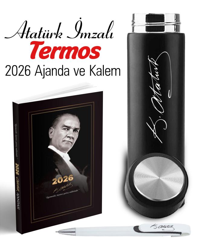 Atatürk İmza Baskılı Termos ve 2026 Atatürk Ajanda - Ayraç - Kartpostal - Kalem