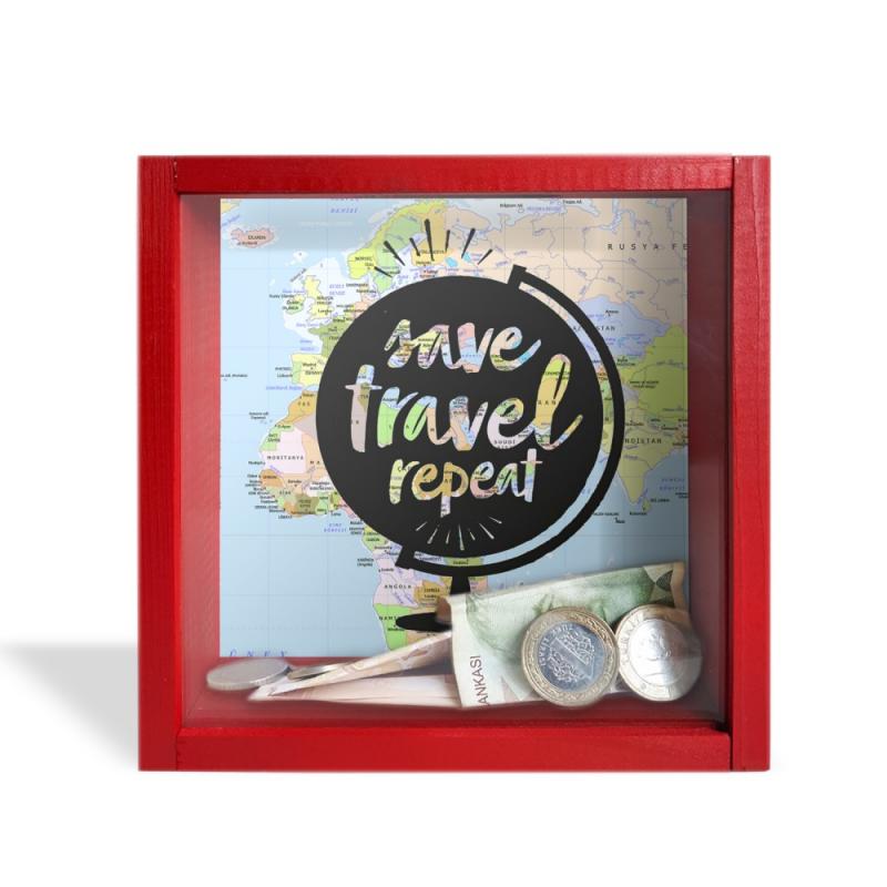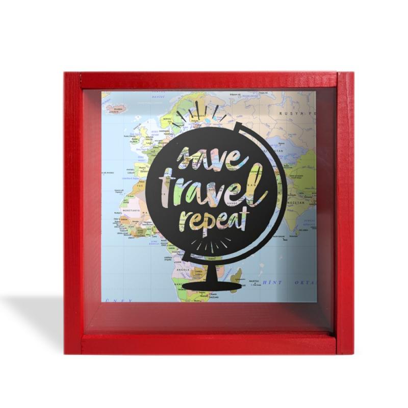 Camlı Ahşap Kumbara Dünya Turu Kırmızı