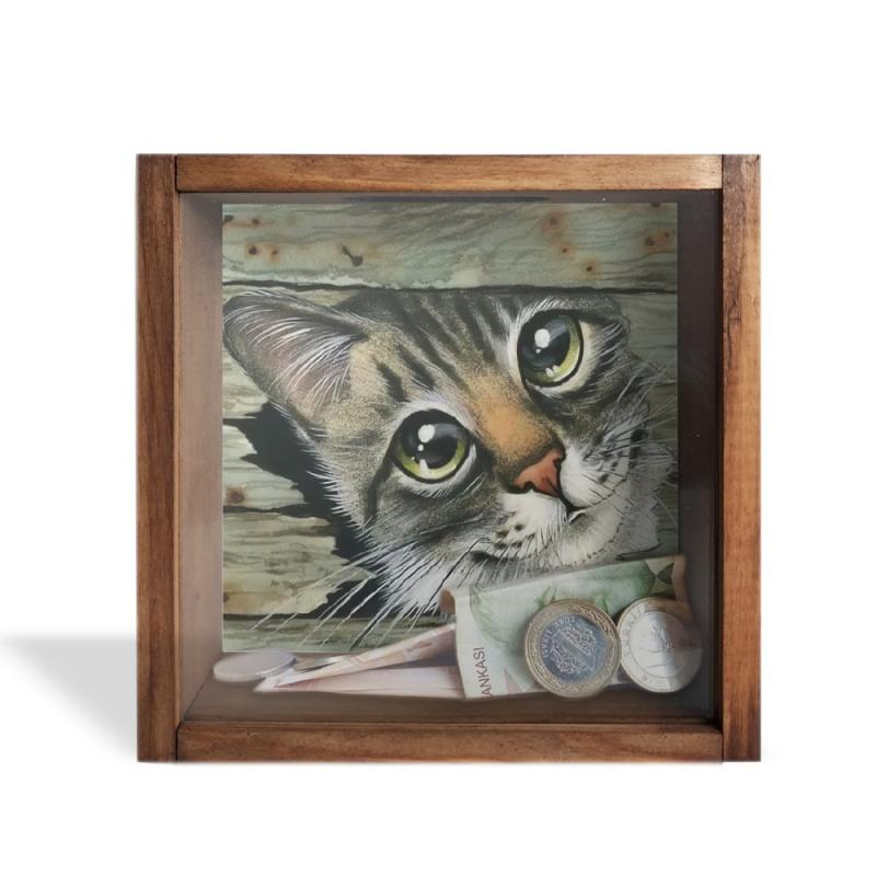 Camlı Ahşap Kumbara Kedicik
