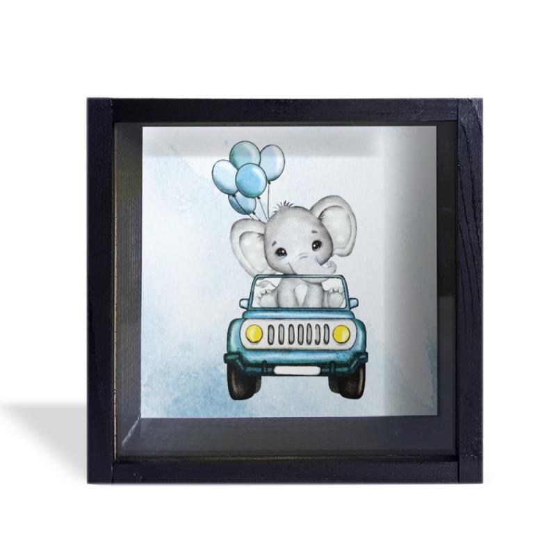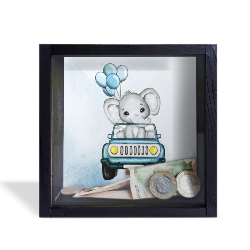 Camlı Ahşap Kumbara Mavi Arabalı Fil Siyah HK0659-0002
