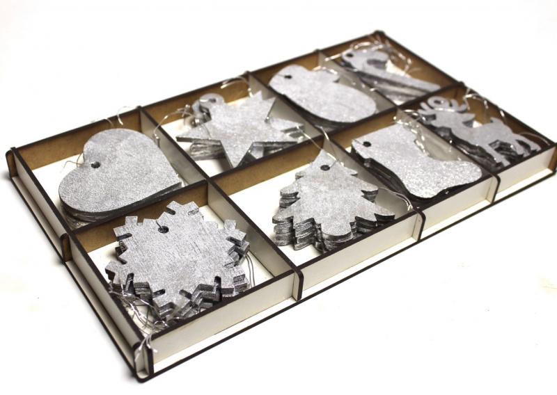 Gümüş Rengi Yılbaşı Ağacı Süsü 8 Model Ahşap Kutuda, 32 Adet