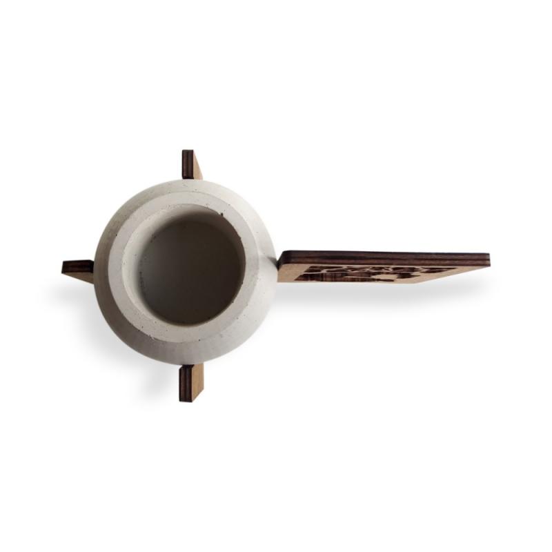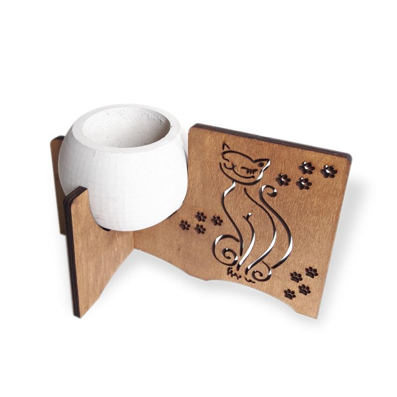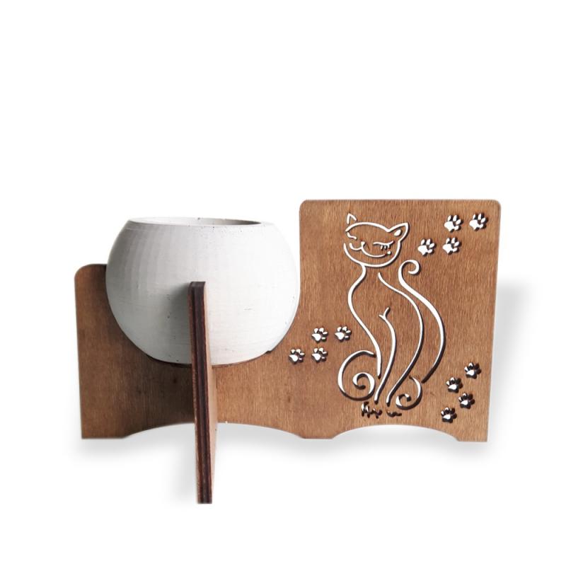 Kedi Figürlü Beton Saksılı Ahşap Stand