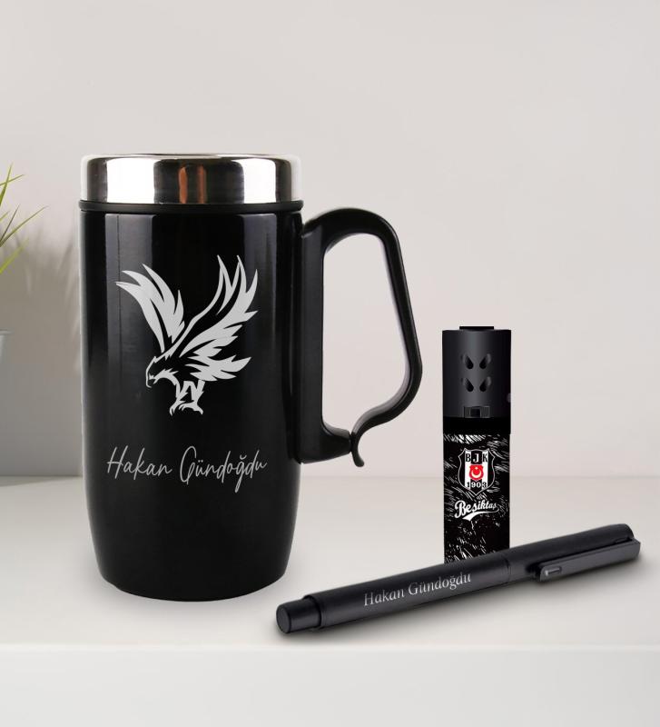 Kişiye Özel Kulplu Çelik Termos Bardak Mug 240ml - Metal Roller Kalem - Turbo Taraftar Çakmak Beşiktaş-2