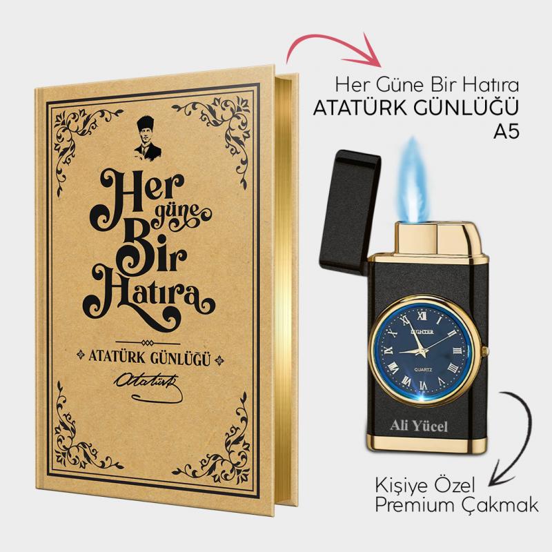 Kişiye Özel - Mat Siyah Saatli Çakmak ve Atatürk Günlüğü A5