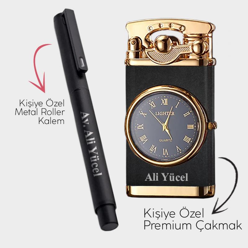 Kişiye Özel - Retro Mat Siyah Saatli Çakmak - Metal Roller Kalem