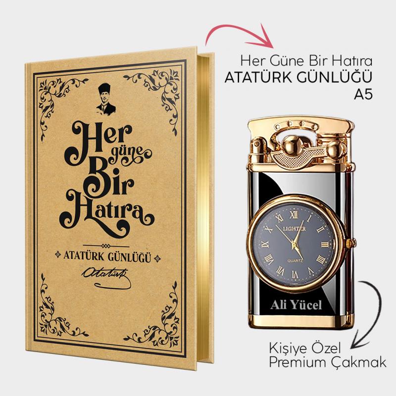 Kişiye Özel - Retro Piano Black Saatli Çakmak ve Atatürk Günlüğü A5