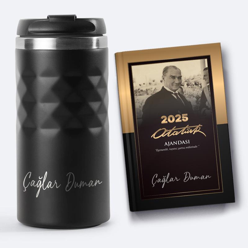 Kişiye Özel Siyah Spor Paslanmaz Çelik Termos 300 ml ve 2025 Ajanda - Cumhuriyet