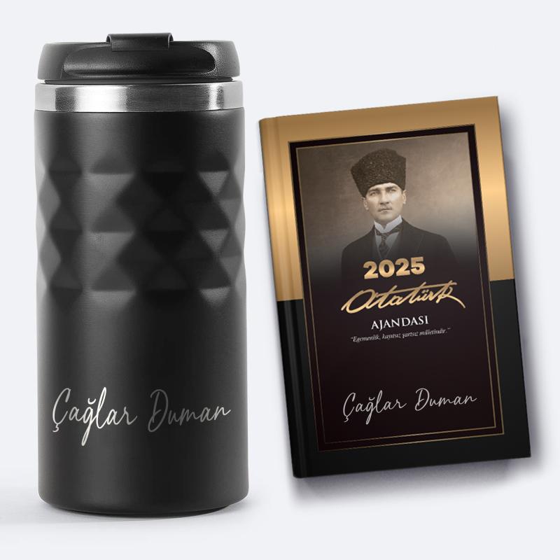 Kişiye Özel Siyah Spor Paslanmaz Çelik Termos 300 ml ve 2025 Ajanda - Kalpaklı