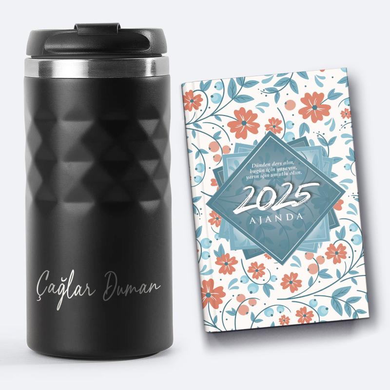 Kişiye Özel Siyah Spor Paslanmaz Çelik Termos 300 ml ve 2025 Ajanda - Mavi Ötesi