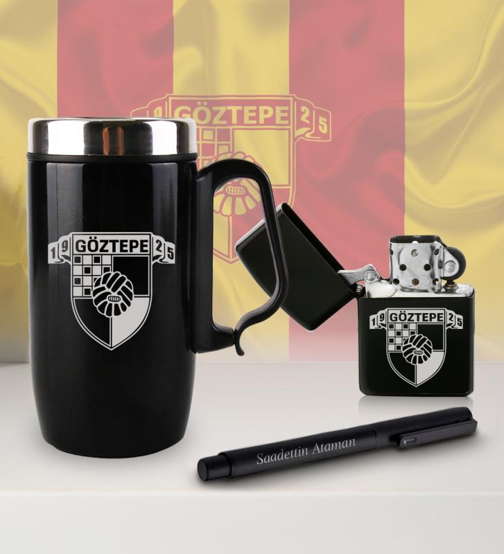 Kişiye Özel Taraftar Seti - Termos Kupa Bardak - Benzinli Çakmak - Metal Roller Kalem - Göztepe
